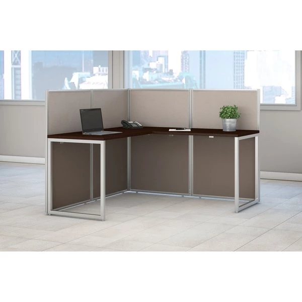 Enjoy a private, productive workspace designed with quality and convenience in mind. The Bush Business Furniture Easy Office 60W L Shaped Cubicle Desk Workstation with 45H Panels offers a simple configuration that can be set up quickly, yet is durable enough to withstand the rigors of everyday use in a fast-paced professional environment. A 60W x 24D Office Desk and 36W x 24D Desk Return connect to form a spacious right or left handed work surface with built-in wire management to keep unsightly cords and cables out of the way. The one-inch thick desktop is able to support up to 200 pounds and features a thermally fused laminate finish that protects it from normal wear and tear. Low 45H Cubicle Panels cover the front of the L Desk to maintain privacy and enhance focus while still allowing for communication between team members. Both the Computer Desk's metal legs and the base of the Privacy Panels include adjustable levelers to compensate for uneven floors. Your choice of attractive Mocha Cherry and Pure White finishes are complemented by contemporary fabric Panels for a professional appearance that suits virtually any workplace. This commercial office furniture set is tested to meet ANSI/BIFMA quality standards for safety and performance. Expand your workspace as needed with Easy Office's broad range of coordinating storage solutions (sold separately).