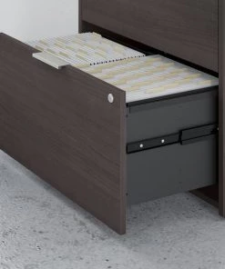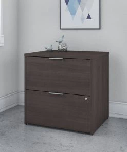Keep important documents organized and secure in any professional space with the Bush Business Furniture Jamestown 2 Drawer Lateral File Cabinet. Whether on its own or as part of a larger configuration, this lockable File Cabinet makes a great addition to any modern office. Two file drawers open on smooth full-extension ball bearing slides for an easy reach to legal, letter and A4-size paperwork. A single lock secures both drawers so your most sensitive documents can be stored safely. The 30W x 24D x 30H lateral filing cabinet is finished on all sides for versatile placement in any private office or open floor plan and includes adjustable levelers for improved stability on uneven floors. Find the perfect look for any work environment with your choice of stylish White and Fresh Walnut, White and Storm Gray or solid Storm Gray finishes with Brushed Satin Nickel hardware. Named in honor of Bush Business Furniture's Western New York headquarters, the Jamestown Collection celebrates both the brand's heritage and its commitment to providing solutions that meet the evolving needs of professional offices. This commercial-grade 2 drawer filing cabinet is tested to meet ANSI/BIFMA quality standards for safety and performance.