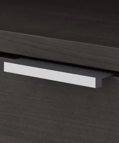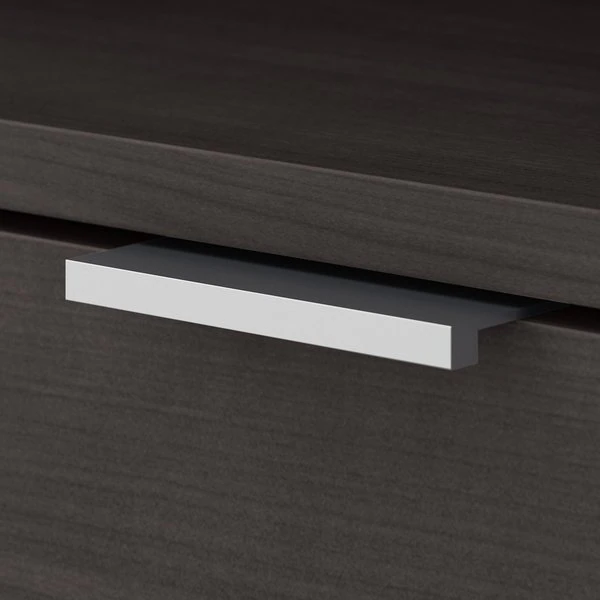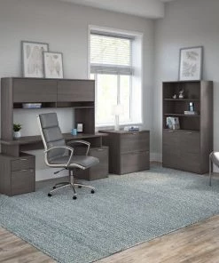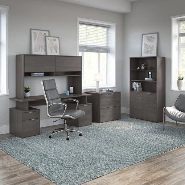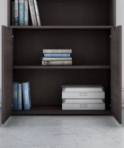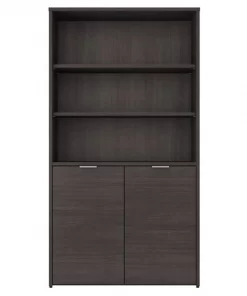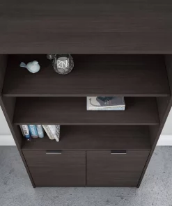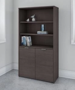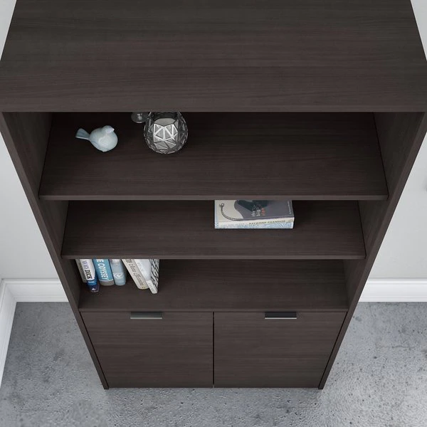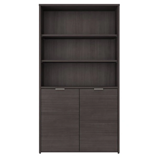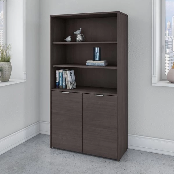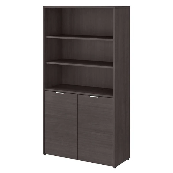 The Bush Business Furniture Jamestown 5 Shelf Bookcase combines closed storage and open display space to offer an ideal organization solution for the modern professional office. Two cabinet doors conceal unsightly reference materials while the top of the bookshelf is left open to show off pictures, decorations or personal achievements. Three adjustable shelves move up and down to accommodate items of various sizes, and two fixed shelves give the 36W x 15D x 66H Bookcase its stability. Each shelf supports up to 50 pounds, so you can confidently store a large collection of paperback or hardcover books, binders and more. Doors open and close on smooth Euro style hinges and feature Brushed Satin Nickel hardware. Choose from stylish White with Fresh Walnut, White with Storm Gray or solid Storm Gray finishes to find the perfect look for any work environment. Named in honor of Bush Business Furniture's Western New York headquarters, the Jamestown Collection celebrates both the brand's heritage and its commitment to providing solutions that meet the evolving needs of professional offices. This commercial-grade 5 Shelf Bookcase with Doors is tested to meet ANSI/BIFMA quality standards for safety and performance.