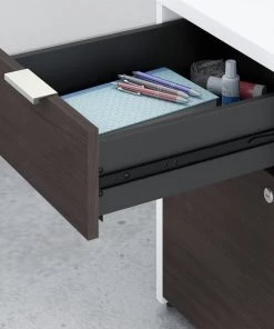With its contemporary style and an adaptable modular design, the Bush Business Furniture Jamestown 60W L Shaped Desk with Drawers is built to meet the ever-changing demands of today's workplace. The elevated 60W x 24D surface easily accommodates multiple monitors and other equipment with a 200 pound weight capacity. A durable thermally fused laminate finish and impact-resistant edge banding protect against the normal wear and tear of a busy office environment. One side of the computer desk is supported by a 60W Low Storage Return with open and closed compartments, each of which includes one adjustable shelf for the flexibility to store items of various sizes. On the other side of the Desk is a 2 Drawer File Cabinet that accepts legal, letter and A4-size paperwork along with small office supplies. A single lock secures both of the filing cabinet's drawers to protect sensitive documents and valuable items. Choose from White with Fresh Walnut, White with Storm Gray or solid Storm Gray finishes to find the perfect look for your space. Named in honor of Bush Business Furniture's Western New York headquarters, the Jamestown Collection celebrates the brand's heritage and its commitment to providing commercial quality solutions for any professional environment, from large offices to remote workspaces. This L Shaped Desk with Storage is tested to meet ANSI/BIFMA standards for safety and performance .