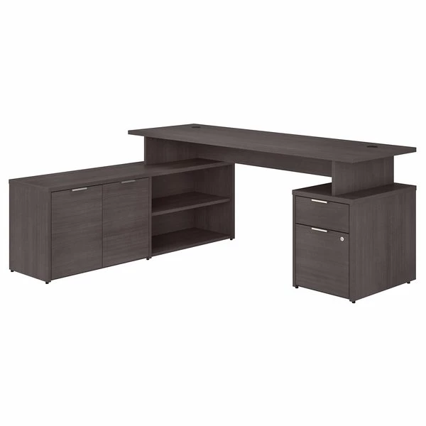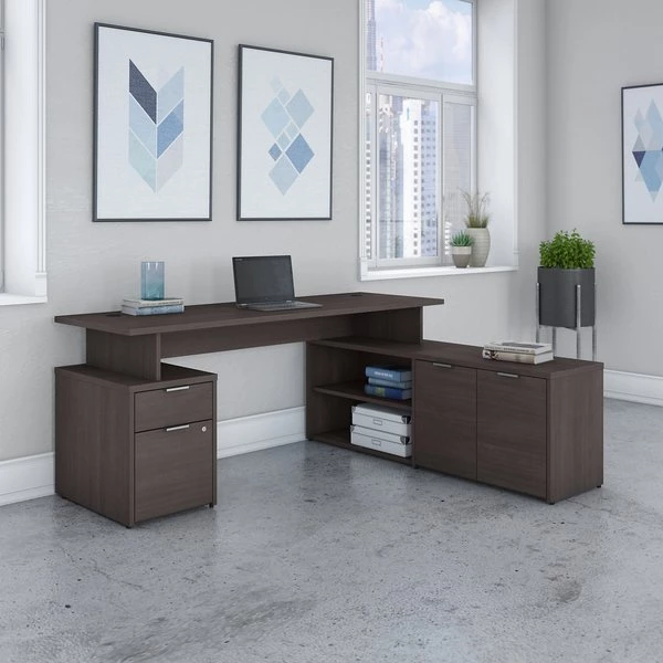 With its contemporary style and an adaptable modular design, the Bush Business Furniture Jamestown 72W L Shaped Desk with Drawers is built to meet the ever-changing demands of today's workplace. The elevated 72W x 24D surface easily accommodates multiple monitors and other equipment with a 200 pound weight capacity. A durable thermally fused laminate finish and impact-resistant edge banding protect against the normal wear and tear of a busy office environment. One side of the computer desk is supported by a 60W Low Storage Return with open and closed compartments, each of which includes one adjustable shelf for the flexibility to store items of various sizes. On the other side of the Desk is a 2 Drawer File Cabinet that accepts legal, letter and A4-size paperwork along with small office supplies. A single lock secures both of the filing cabinet's drawers to protect sensitive documents and valuable items. Choose from White with Fresh Walnut, White with Storm Gray or solid Storm Gray finishes to find the perfect look for your space. Named in honor of Bush Business Furniture's Western New York headquarters, the Jamestown Collection celebrates the brand's heritage and its commitment to providing commercial quality solutions for any professional environment, from large offices to remote workspaces. This L Shaped Desk with Storage is tested to meet ANSI/BIFMA standards for safety and performance .