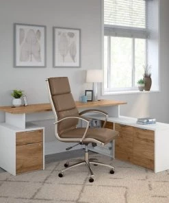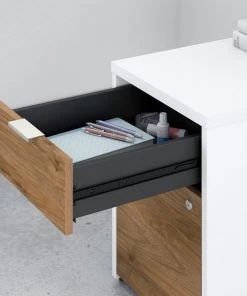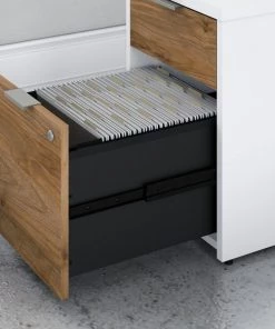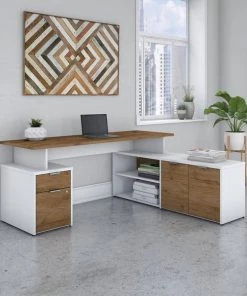 With its contemporary style and an adaptable modular design, the Bush Business Furniture Jamestown 72W L Shaped Desk with Drawers is built to meet the ever-changing demands of today's workplace. The elevated 72W x 24D surface easily accommodates multiple monitors and other equipment with a 200 pound weight capacity. A durable thermally fused laminate finish and impact-resistant edge banding protect against the normal wear and tear of a busy office environment. One side of the computer desk is supported by a 60W Low Storage Return with open and closed compartments, each of which includes one adjustable shelf for the flexibility to store items of various sizes. On the other side of the Desk is a 2 Drawer File Cabinet that accepts legal, letter and A4-size paperwork along with small office supplies. A single lock secures both of the filing cabinet's drawers to protect sensitive documents and valuable items. Choose from White with Fresh Walnut, White with Storm Gray or solid Storm Gray finishes to find the perfect look for your space. Named in honor of Bush Business Furniture's Western New York headquarters, the Jamestown Collection celebrates the brand's heritage and its commitment to providing commercial quality solutions for any professional environment, from large offices to remote workspaces. This L Shaped Desk with Storage is tested to meet ANSI/BIFMA standards for safety and performance .