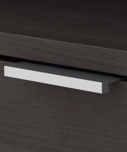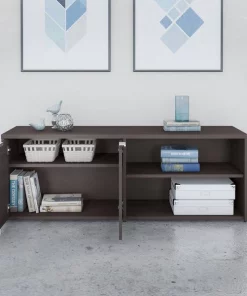 Featuring a multipurpose design that's both stylish and practical, the Bush Business Furniture Jamestown Low Storage Cabinet with Doors and Shelves makes a great addition to any modern professional office. This versatile organizer can be used on its own as a standalone storage credenza or as a return to form an L shaped desk with coordinating 60W and 72W work surfaces (sold separately). The durable surface supports up to 200 pounds while open and closed compartments each include one adjustable shelf to accommodate everything from reference materials to decorations. Cabinet doors feature attractive Brushed Satin Nickel handles and open on smooth Euro style hinges for an effortless reach to contents. This 60W x 16D x 21H Storage Cabinet is finished on all sides for versatile placement in a private office or open floor plan and includes adjustable levelers for improved stability on uneven floors. Choose from stylish White with Fresh Walnut, White with Storm Gray or solid Storm Gray finishes to find the perfect look for any work environment. Named in honor of Bush Business Furniture's Western New York headquarters, the Jamestown Collection celebrates both the brand's heritage and its commitment to providing solutions that meet the evolving needs of professional offices. This commercial-grade low storage credenza is tested to meet ANSI/BIFMA quality standards for safety and performance.