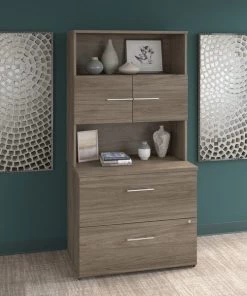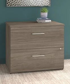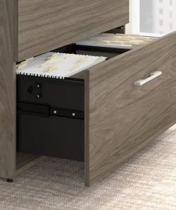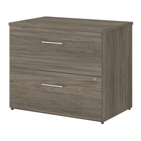 Organize important paperwork safely and efficiently with the Bush Business Furniture Office 500 2 Drawer Lateral File Cabinet. A great addition to any workspace, this filing cabinet features two large drawers that accept legal, letter and A4-size documents while supporting up to 88 pounds each. Both drawers open on smooth full-extension ball bearing slides for an effortless reach to contents and are secured by a single lock to protect files that contain sensitive information. The drawers are designed to open one at a time for maximum stability on any surface, and the base includes adjustable levelers to compensate for uneven floors. Office 500 provides a variety of customizable workspace solutions that are perfect for showcasing the style and personality of today's professionals. One lateral filing cabinet accepts the coordinating 36W Bookcase Hutch while two positioned side by side can accept a 72W Desk Hutch for increased storage and display capacity (Hutches sold separately). Your choice of Black Walnut, Sand Oak, Modern Hickory and Storm Gray finishes with Light Silver drawer pulls make it easy to find the right look for any office environment. This locking File Cabinet is tested to meet ANSI/BIFMA quality standards for safety and performance. See the full collection for coordinating items available.