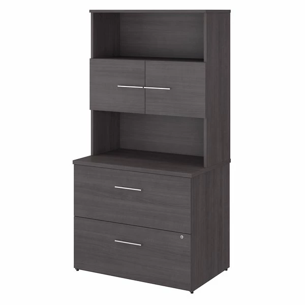 The Bush Business Furniture Office 500 36W 2 Drawer Lateral File Cabinet with Hutch is perfect for maintaining an organized workspace while showcasing the style and personality of today's professional. Two file drawers open on smooth full-extension ball bearing slides for an effortless reach to legal, letter and A4-size paperwork. A single lock secures both drawers to protect documents that contain sensitive information. Drawers support up to 88 pounds each and are designed to open one at a time for maximum stability. The 36W Bookcase Hutch attaches to the top of the Lateral Filing Cabinet, adding two open shelves that are great for storing books or brightening up the room with your favorite pictures, awards and decorations. An elevated 2 door storage cabinet conceals the reference materials and supplies you want kept in order but out of sight. Each of the Hutch's shelves has a weight capacity of 50 pounds, so organizing larger items is no problem. Your choice of stylish Black Walnut, Sand Oak, Modern Hickory and Storm Gray finishes with Light Silver hardware make it easy to find the perfect look for any office environment. This tall bookshelf with drawers is tested to meet ANSI/BIFMA quality standards for safety and performance. See the full collection for coordinating items available.