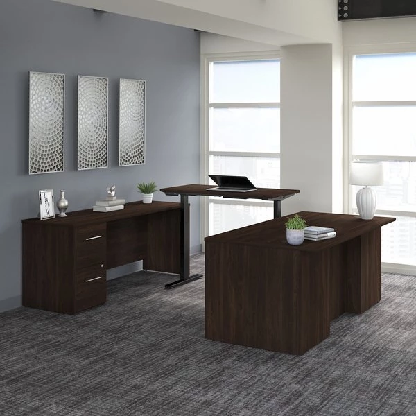 With its impressive breakfront design and the flexibility to sit or stand at the push of a button, the Bush Business Furniture Office 500 72W Height Adjustable U Shaped Executive Desk with Drawers presents an ideal workspace for the modern professional. Take a prominent position in your private office as you spread out on a spacious wraparound desk with built-in wire management. The electric 48W x 24D Height Adjustable Standing Desk Bridge lifts anywhere from 27 to 46.7 inches from the floor and includes four customizable presets that allow you to change positions quickly and easily throughout the day. Each surface supports up to 200 pounds so you can work with all your materials at any height. A scratch and stain-resistant finish preserves the U Desk's appearance throughout years of use in a busy work environment. A 3 Drawer File Cabinet and 2 Drawer File Cabinet fit under the fixed desktop for easy access to legal, letter and A4-size paperwork and supplies. All three file drawers and one of two box drawers can be locked to secure sensitive documents and personal items. Your choice of Black Walnut, Sand Oak, Modern Hickory and Storm Gray finishes with Light Silver drawer pulls make it easy to find the perfect look for any office. This Adjustable Desk with Storage is tested to meet ANSI/BIFMA quality standards for safety and performance.