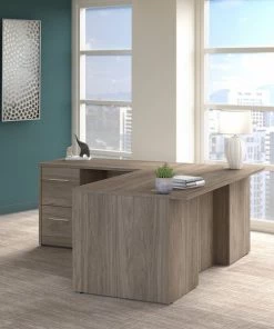 Highlighted by its distinctive breakfront design, the Bush Business Furniture Office 500 72W L Shaped Executive Desk with Drawers presents a workspace that showcases the style and personality of today's professional. Take a prominent position in your private office as you get to work on a spacious right or left handed desktop with built-in wire management. Commercial quality construction allows the L Shaped Computer Desk to support multiple monitors and other equipment with a weight capacity of 200 pounds, and the durable thermally fused laminate surface resists scratches and stains to preserve its appearance throughout years of use in a busy work environment. A 3 Drawer File Cabinet and 2 Drawer File Cabinet fit underneath the L Desk for easy access to materials. File drawers accept legal, letter and A4-size paperwork while two box drawers organize writing utensils, notepads and other supplies. All three file drawers and one box drawer can be locked to secure sensitive documents and personal items. Your choice of Black Walnut, Sand Oak, Modern Hickory and Storm Gray finishes with Light Silver drawer pulls make it easy to find the perfect look for any professional office. This L Shaped Desk with Storage is tested to meet ANSI/BIFMA quality standards for safety and performance. See the full collection for coordinating items available.