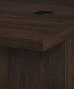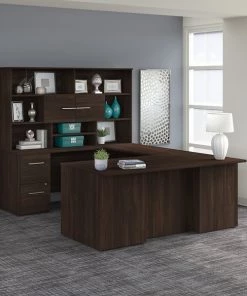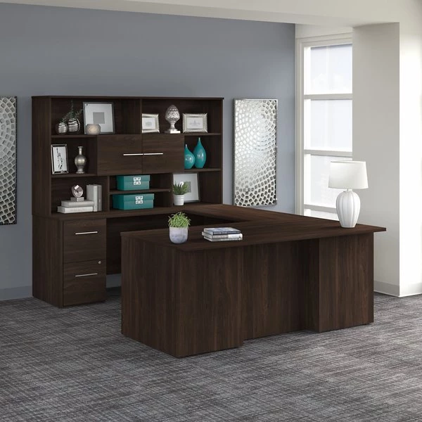 Highlighted by its distinctive breakfront design, the Bush Business Furniture Office 500 72W U Shaped Executive Desk with Drawers and Hutch presents a workspace that showcases the style and personality of today's professional. Spread out on a spacious wraparound desktop that includes built-in wire management and supports multiple monitors and other equipment with a weight capacity of 200 pounds. The U Desk's durable thermally fused laminate surface resists everyday damage like scratches and stains to preserve its appearance throughout years of use in a busy work environment. A 3 Drawer File Cabinet and 2 Drawer File Cabinet fit under the desktop for easy access to legal, letter and A4-size paperwork and supplies. All three file drawers and one of two box drawers can be locked to secure sensitive documents and personal items. The 72W Hutch adds plenty of open shelf space for books, pictures, awards and decorations while a small storage cabinet conceals unsightly reference materials and miscellaneous accessories. Your choice of Black Walnut, Sand Oak, Modern Hickory and Storm Gray finishes with Light Silver drawer pulls make it easy to find the perfect look for any professional office. This U Shaped Desk with Hutch and Storage is tested to meet ANSI/BIFMA quality standards for safety and performance. See the full collection for coordinating items available.