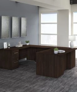 Highlighted by its distinctive breakfront design, the Bush Business Furniture Office 500 72W U Shaped Executive Desk with Drawers presents a workspace that showcases the style and personality of today's professional. Take a prominent position in your private office as you spread out on a spacious wraparound desktop with built-in wire management. Commercial quality construction allows the computer desk to support multiple monitors and other equipment with a weight capacity of 200 pounds, and the durable thermally fused laminate surface resists everyday damage like scratches and stains to preserve its appearance throughout years of use in a busy work environment. A 3 Drawer File Cabinet and 2 Drawer File Cabinet fit underneath the U Desk for easy access to materials. File drawers accept legal, letter and A4-size paperwork while two box drawers organize writing utensils, notepads and other supplies. All three file drawers and one box drawer can be locked to secure sensitive documents and personal items. Your choice of Black Walnut, Sand Oak, Modern Hickory and Storm Gray finishes with Light Silver drawer pulls make it easy to find the perfect look for any professional office. This U Shaped Desk with Storage is tested to meet ANSI/BIFMA quality standards for safety and performance. See the full collection for coordinating items available.