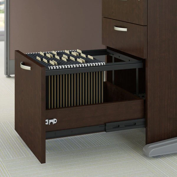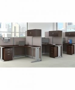 Create an efficient, organized workspace for three in a matter of minutes. The Bush Business Furniture Office in an Hour 3 Person L Shaped Cubicle Workstations combine thermally fused laminate surfaces with sturdy steel legs to resist scratches, stains and damage. In addition to the desks, the workstations have metal-framed panels covered by stylish two-tone fabric. The desks and cubicle panels include adjustable levelers to compensate for uneven floors. A convenient cable management system features desktop grommets and removable panels in the metal legs for organizing cords. Keep your supplies and documents in order with the Storage Cabinet, Adjustable Paper Tray, Pencil Cup and Mobile File Cabinet, all included with each workstation. The assembled Storage Cabinet mounts to a 63H Panel and includes necessary hardware. The Mobile File Cabinet drawers open on full-extension ball bearing slides for a smooth and easy reach to the back. Two box drawers work great for personal items, pens and paper, while a file drawer holds letter and legal-sized folders. The Paper Tray and Pencil Cup mount to the 48H Panels to further organize your work surface. Turn open spaces into efficient offices with these easy-to-assemble 3 Person Cubicle Workstations. Meets ANSI/BIFMA standards for safety and performance.