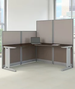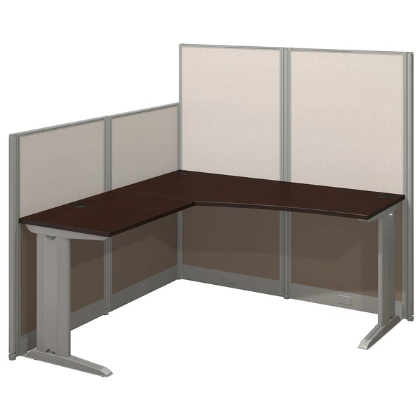 Create an efficient, organized workspace in a matter of minutes with the Bush Business Furniture Office in an Hour 65W x 65D L Shaped Cubicle Workstation. The L Shaped Desk combines a spacious thermally fused laminate surface with sturdy steel legs to resist scratches, stains and damage. In addition to the desk, the workstation includes two 48H and two 63H cubicle panels, along with all necessary hardware. These metal-framed panels are covered by stylish two-tone fabric. The desk and cubicle panels include adjustable levelers to compensate for uneven floors. A convenient cable management system features desktop grommets and removable panels in the metal legs for organizing cords. Turn open spaces into efficient offices with this cubicle workstation that can be completely assembled in less than an hour. This collection can easily expand into multiple desk configurations as your business grows and accepts a convenient Storage and Accessory Kit (sold separately) to keep all of your items in order. Solid construction meets ANSI/BIFMA standards for safety and performance. Commercial quality backed by the Bush Business Furniture .