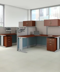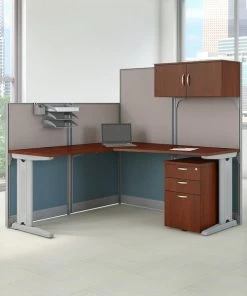 Create an efficient, organized workspace in a matter of minutes with the Bush Business Furniture Office in an Hour 65W x 65D L Shaped Cubicle Workstation. The L Shaped Desk combines a spacious thermally fused laminate surface with sturdy steel legs to resist scratches, stains and damage. In addition to the desk, the workstation includes two 48H and two 63H cubicle panels, along with all necessary hardware. These metal-framed panels are covered by stylish two-tone fabric. The desk and cubicle panels include adjustable levelers to compensate for uneven floors. A convenient cable management system features desktop grommets and removable panels in the metal legs for organizing cords. Keep your supplies and documents in order with the included Storage Cabinet, Adjustable Paper Tray, Pencil Cup and Mobile File Cabinet. The assembled Storage Cabinet mounts to a 63H Panel and includes necessary hardware. The Mobile File Cabinet drawers open on full-extension ball bearing slides for a smooth and easy reach to the back. Two box drawers work great for personal items, pens and paper, while a file drawer holds letter and legal-sized folders. Turn open spaces into efficient offices with this cubicle workstation that can be completely assembled in less than an hour. Meets ANSI/BIFMA standards for safety and performance. Backed by the Bush Business Furniture .