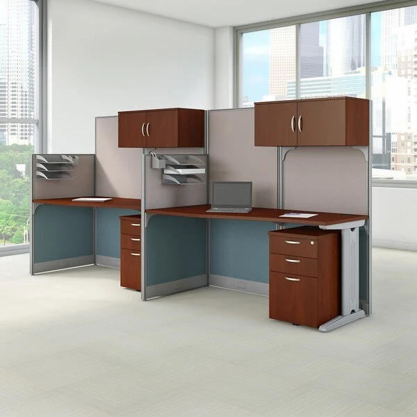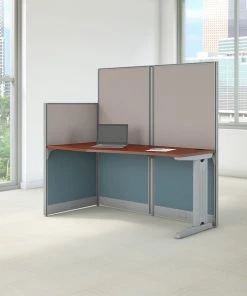 Create an efficient, organized workspace in a matter of minutes with the Bush Business Furniture Office in an Hour 65W x 33D Cubicle Workstation. The office desk combines a thermally fused laminate surface with sturdy steel legs to resist scratches, stains and damage. In addition to the desk, the workstation includes one 48H and two 63H cubicle panels, along with all necessary hardware. These metal-framed panels are covered by stylish two-tone fabric. The desk and cubicle panels include adjustable levelers to compensate for uneven floors. A convenient cable management system features desktop grommets and removable panels in the metal legs for organizing cords. Turn open spaces into efficient offices with this compact workstation that can be completely assembled in less than an hour. This collection can easily expand into multiple desk configurations as your business grows and accepts a convenient Storage and Accessory Kit (sold separately) to keep all of your items in order. Solid construction meets ANSI/BIFMA standards for safety and performance. Commercial quality backed by the Bush Business Furniture .