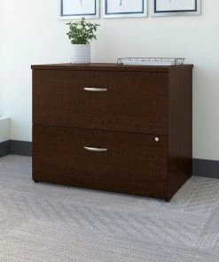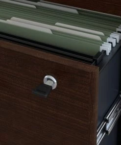 Organize your workspace with the stylish and reliable Bush Business Furniture Office in an Hour Lateral File Cabinet. Store your letter, legal and A4 documents in 2 generous drawers gliding on smooth full-extension ball bearing slides for an effortless reach to the back. Both drawers accept hanging folders to help you design an orderly filing system. Adjustable levelers compensate for uneven flooring, while an interlocking drawer mechanism prevents against tipping. Brushed Nickel hardware and clean lines make an impressive statement, as the sturdy design fends off damage for years of professional quality. A face-front lock secures both drawers for your privacy. Designed to match Office in an Hour products, the 2 drawer Cabinet meets ANSI/BIMFA quality standards. See the full collection to complete your office.