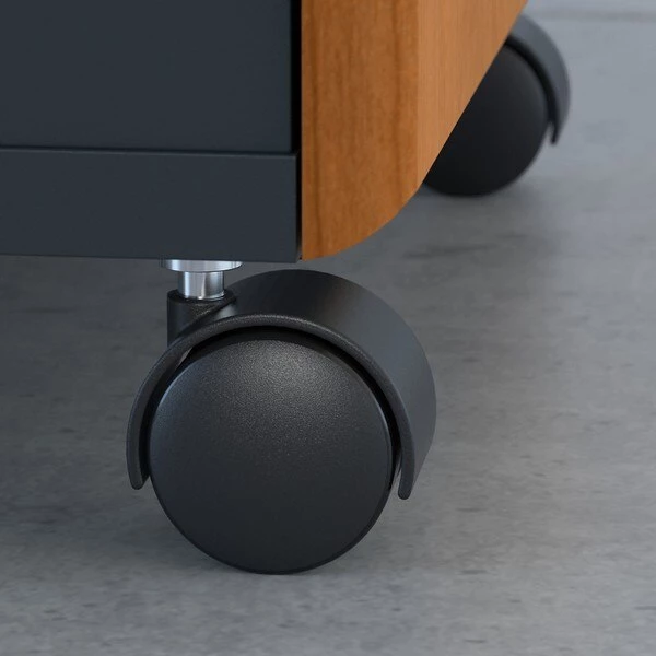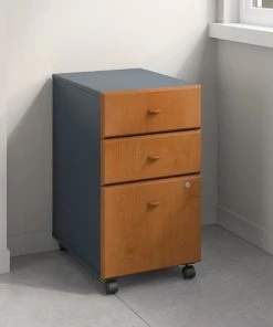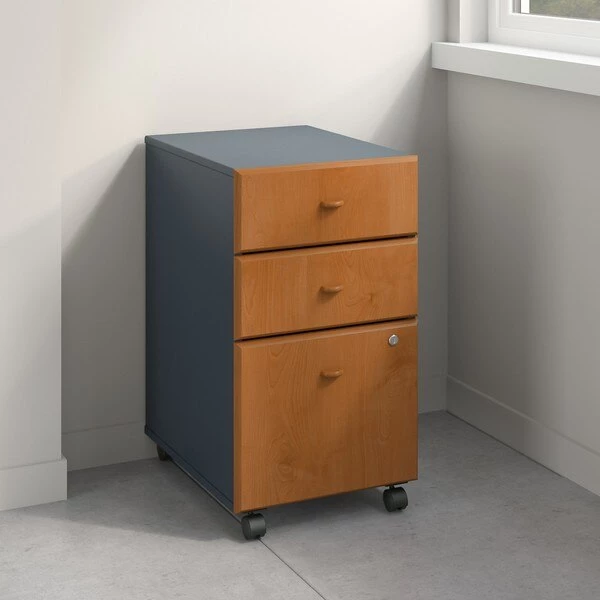 Create more storage space with the affordable and functional Bush Business Furniture Series A 3 Drawer Mobile File Cabinet. With a file drawer gliding on smooth full-extension ball bearing slides, the Cabinet provides effortless access to letter, legal and A4-sized documents. 2 box drawers keep office supplies at your fingertips. Slide the Mobile File Cabinet under your Series A Desk to minimize your office footprint, or roll it wherever you need it most. Dual-wheeled, hooded casters ensure easy movement, while a single lock secures the lower 2 drawers for your privacy. The sturdy construction resists scratches, stains and dents for long-lasting quality. Series A completes your multi-person workspace, classroom, home office or anywhere in between with a variety of configuration options. Featuring 7 attractive two-tone finishes, clean lines and contemporary styling, this commercial office furniture adapts to your surroundings. Customize any environment with a complete line of affordable products and accessories. Series A withstands the rigors of a 40-plus hour week and meets ANSI/BIFMA quality test standards.