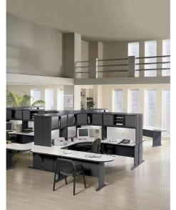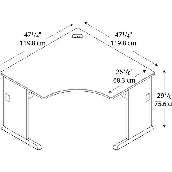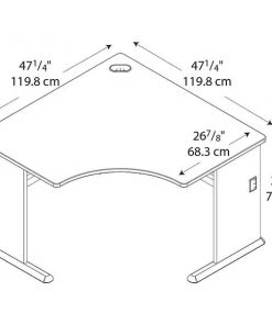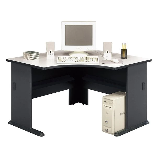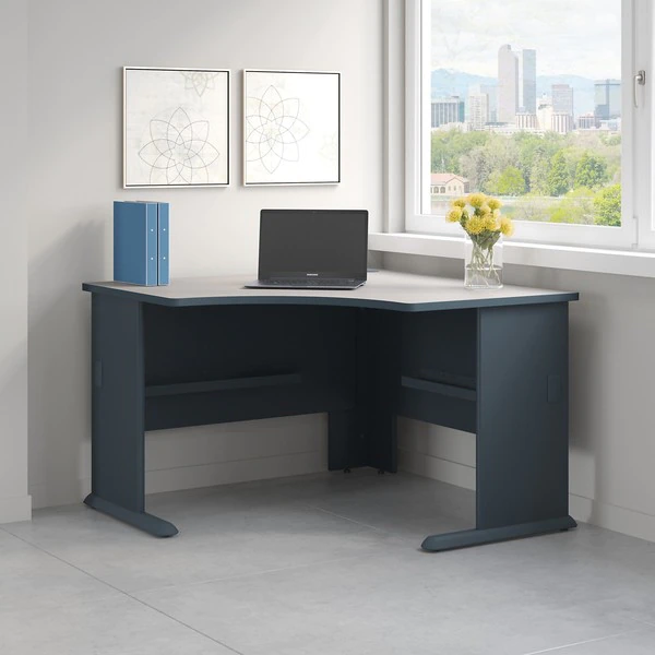 The Bush Business Furniture 48W Corner Desk maximizes your small office space with a convenient design and commercial-grade quality. Ideal for use in a corner, the Desk provides a comfortable curved work area, and a C-Leg design creates plenty of legroom. A scratch-resistant thermally fused laminate surface and thick end panels fend off damage, while sturdy feet with adjustable levelers ensure stability. Keep your cables in order with a comprehensive wire management system. Expand your work surface with coordinating Series A Desks, and add a Hutch, Keyboard Tray or Pencil Drawer (all sold separately). Series A completes your multi-person workspace, classroom, home office or anywhere in between with a variety of layout options. Featuring 7 attractive two-tone finishes and contemporary styling, this commercial office furniture adapts to your surroundings. Customize any environment with a full line of affordable products. Series A withstands the rigors of a 40-plus hour week and meets ANSI/BIFMA quality test standards.