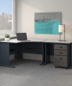Work comfortably while saving space with this Bush Business Furniture Series A 48W Corner Desk. Designed for placement in a corner, the Desk includes a comfortable curved work area and an open C-Leg design for added legroom. A 36W Desk expands the work surface, allowing you to spread out with your computer, printer, paperwork and more, while a comprehensive wire management system keeps cables out of your way. Depend on the scratch-resistant thermally fused laminate finish, thick end panels and rugged edge banding for years of professional quality. Roll the Mobile File Cabinet anywhere or leave it under the Desk to conserve floor space. A full-extension file drawer holds letter, legal and A4 documents while gliding on smooth ball bearing slides for an easy reach to the back. Series A completes your multi-person workspace, classroom, home office or anywhere in between with a variety of configuration options. Featuring 7 attractive two-tone finishes and contemporary styling, this commercial office furniture adapts to your surroundings. Customize any environment with a full line of affordable products. Series A withstands the rigors of a 40-plus hour week and meets ANSI/BIFMA quality test standards.