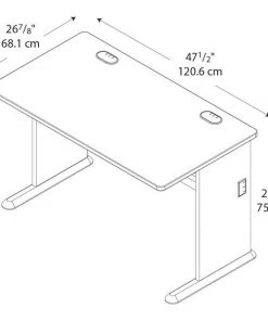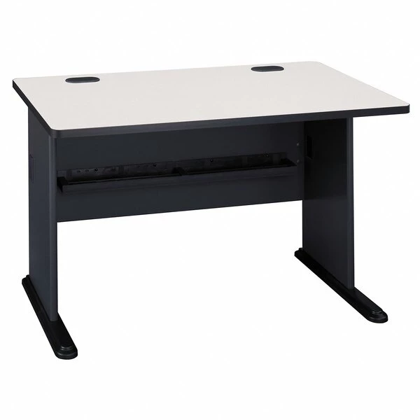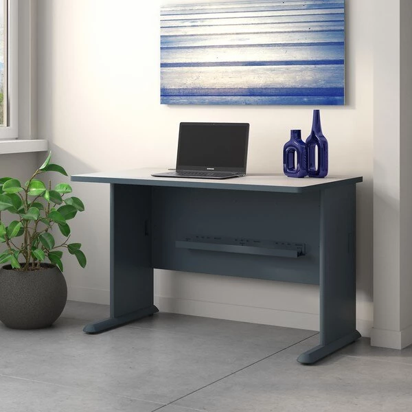 The Bush Business Furniture Series A 48W Desk provides lasting comfort and durability in a compact package. Perfect for a small office or as part of a larger workspace, the commercial-grade Desk features an open C-Leg design to maximize legroom. Thick end panels resist damage, while a thermally fused laminate surface fends off scratches and stains for a long-lasting professional appearance. A comprehensive wire management system organizes and secures computer cables to keep them out of your way. Sturdy Desk feet include encapsulated steel armature and adjustable levelers for use on all types of flooring. The Office Desk accepts a coordinating Hutch, Mobile File Cabinets, Keyboard Tray or Pencil Drawer (all sold separately). Series A completes your multi-person workspace, classroom, home office or anywhere in between with a variety of configuration options. Featuring 7 attractive two-tone finishes and contemporary styling, this commercial office furniture adapts to your surroundings. Customize any environment with a full line of affordable products. Series A withstands the rigors of a 40-plus hour week and meets ANSI/BIFMA quality test standards.