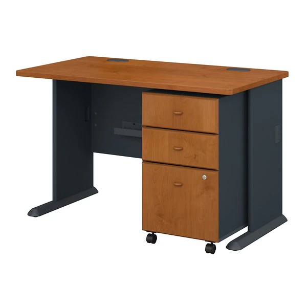 The Bush Business Furniture Series A 48W Desk provides lasting comfort and durability in a compact package. Perfect for a small office or as part of a larger workspace, the commercial-grade Desk features an open C-Leg design to maximize legroom. Thick end panels resist damage, while a thermally fused laminate surface fends off scratches and stains for a long-lasting professional appearance. A comprehensive wire management system organizes and secures computer cables to keep them out of your way. Conserve space and store work materials in the convenient Mobile File Cabinet, which fits under the Desk or rolls anywhere and locks for your security. The full-extension file drawer holds letter, legal and A4 documents. Drawers open on ball bearing slides for a smooth and easy reach to the back. Series A completes your multi-person workspace, classroom, home office or anywhere in between with a variety of configuration options. Featuring 7 attractive two-tone finishes and contemporary styling, this commercial office furniture adapts to your surroundings. Customize any environment with a full line of affordable products. Series A withstands the rigors of a 40-plus hour week and meets ANSI/BIFMA quality test standards.