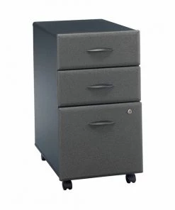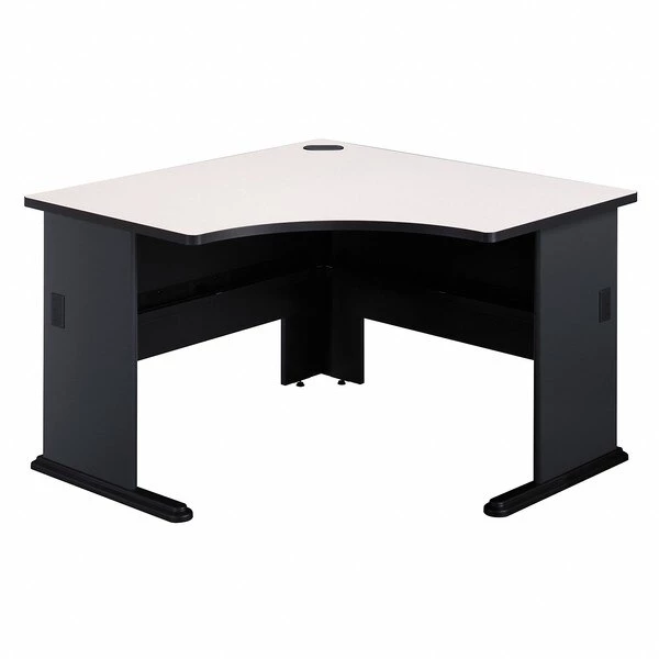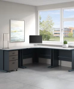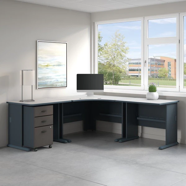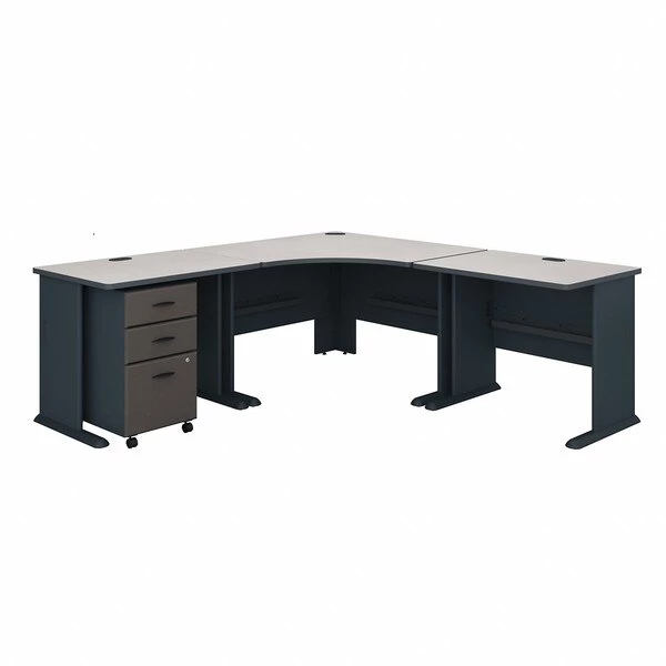 The Bush Business Furniture Series A 84W x 84D Corner Desk maximizes your office space with expansive work surfaces in an efficient package. Set the Desk up in a corner, spread out with your electronics and papers, and feed cables through wire management grommets for a clean look. The thermally fused laminate finish, durable edge banding and thick end panels fend off scratches, stains and damage. Get to work on the comfortable curved surface and enjoy all the legroom you need with the open C-Leg design. Store supplies and documents in the Mobile File Cabinet, which rolls anywhere or fits under the Corner Desk. A full-extension file drawer glides on smooth ball bearing slides for an easy reach to letter, legal or A4 documents. Series A completes your multi-person workspace, classroom, home office or anywhere in between with a variety of configuration options. Featuring 7 attractive two-tone finishes and contemporary styling, this commercial office furniture adapts to your surroundings. Customize any environment with a full line of affordable products. Series A withstands the rigors of a 40-plus hour week and meets ANSI/BIFMA quality test standards.