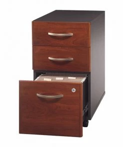 Enjoy mobile storage that works wherever you do. The Bush Business Furniture Series C 3 Drawer Mobile File Cabinet rolls smoothly on dual-wheeled, hooded casters for years of easy, everyday use. Slide the Cabinet under a coordinating Series C Desk to save space or move it around the office as needed. A single lock secures the bottom two drawers to protect your letter, legal and A4 files. The file drawer glides on smooth, full-extension ball bearing slides for an effortless reach to the back, and two box drawers store office supplies. Brushed Nickel hardware makes a lasting impression. The options are endless with Series C. This affordable commercial office furniture boasts quality craftsmanship, user-friendly features and 7 stylish finishes to blend seamlessly in any environment. Multiple layout options meet the needs of numerous workspaces, from the private or home office to reception areas and conference rooms. Affordably priced but built to last, this office furniture withstands the rigors of a 40-plus hour week. Series C evolves with your office and your preferences, allowing you to reconfigure your workspace as required with a complete line of coordinated products and accessories.