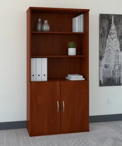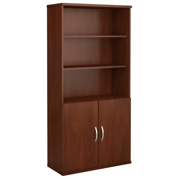 The Bush Business Furniture Series C 36W 5 Shelf Bookcase with Doors brings open display space and concealed storage to your office. Backed by commercial-grade quality, the Bookcase boasts a classic design and includes three adjustable shelves for displaying books, binders or objects of varying heights. Two doors with self-closing Euro-style hinges conceal the lower shelves, providing the perfect place for office supplies. Two fixed shelves ensure stability, while the heavy-duty construction stands up to years of use. Add one Bookcase to your home or office, or combine two or more to create a storage wall. The options are endless with Series C. This affordable office furniture boasts quality craftsmanship to withstand the rigors of a 40-plus hour work week. Seven stylish finishes blend seamlessly in any environment. Multiple layout options meet the needs of numerous workspaces, from the private or home office to reception areas and conference rooms. Series C evolves with your preferences, allowing you to reconfigure your workspace as required with a complete line of coordinated commercial office furniture.