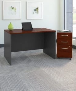 Get quality and convenience in a commercial-grade package that fits nearly anywhere. The Bush Business Furniture Series C 48W Office Desk brings user-friendly features and a sturdy construction to your workspace. Make a professional statement in the office or work from home in style with the clean lines, extended modesty panels and Brushed Nickel hardware of Series C. A thermally fused laminate finish and durable edge banding resist damage for years of continued use. Feed your computer cables through wire management grommets in the work surface to eliminate clutter, and store office supplies and documents in the Mobile File Cabinet. A full-extension file drawer glides on smooth ball bearing slides for an easy reach to the back, and the Cabinet rolls for your convenience. The options are endless with Series C. This affordable office furniture boasts quality craftsmanship to withstand the rigors of a 40-plus hour work week. Seven stylish finishes blend seamlessly in any environment. Multiple layout options meet the needs of numerous workspaces, from the private or home office to reception areas and conference rooms. Series C evolves with your preferences, allowing you to reconfigure your workspace as required with a complete line of coordinated products.
