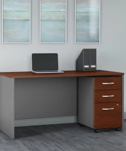 The Bush Business Furniture Series C 60W x 30D Office Desk with 3 Drawer Mobile File Cabinet combines classic styling with the commercial quality construction needed to thrive in today's work environments. Built to endure the rigors of a busy professional office, the durable thermally fused laminate work surface and sturdy end panels protect the computer desk from normal wear and tear to preserve its appearance throughout years of everyday use. The 60-inch desktop boasts a weight capacity of 200 pounds, allowing it to support multiple monitors and other materials while built-in wire management grommets keep cords and cables in order. This workstation desk with drawers is finished on all sides to look great facing any direction in a private or open-plan office. With its four dual-wheeled casters, the small filing cabinet is able to provide convenient storage anywhere in your office, including underneath the desktop. A single file drawer opens on smooth full-extension ball bearing slides for an easy reach to letter, legal and A4-size paperwork while two box drawers organize supplies. The two bottom drawers can be locked to secure sensitive documents and personal items. Find the perfect look to complement your workspace with four traditional finish options. This Office Desk with File Cabinet is tested to meet ANSI/BIFMA standards for safety and performance.