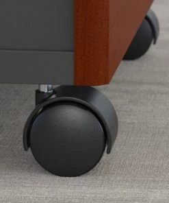 The Bush Business Furniture Series C Right Hand 3 Position Sit to Stand L Shaped Desk with Mobile File Cabinet offers an ergonomic workspace for the health-conscious professional. A 60W x 43D Bow Front Desk and a 42W x 24D Sit to Stand Return attach to form a space-saving configuration, and both feature scratch-resistant 1 inch thick thermally fused laminate surfaces with wire management. The inviting Bow Front design extends the surface of the desk so guests are able to pull up a chair and collaborate. As a quality alternative to desktop risers, the innovative Sit to Stand Return offers all the health benefits of a standing desk with the versatility of more expensive electric height adjustable options. The mechanical Lift-n-Lock system allows the desktop to lock into place at standing heights of 36, 39 and 42 inches from the floor and easily returns to a seated position. The 3 drawer filing cabinet's bottom drawer opens on smooth full-extension ball bearing slides and holds legal, letter and A4 size files while a built-in lock protects sensitive documents. Fixed desks and storage are tested to meet ANSI/BIFMA standards for safety and performance, and the mechanical lift system is rigorously tested to meet Bush Business Furniture's own quality standards. This office furniture set comes in your choice of stylish Mocha Cherry or Hansen Cherry with Graphite Gray finishes.