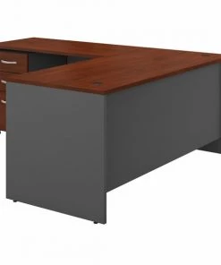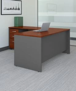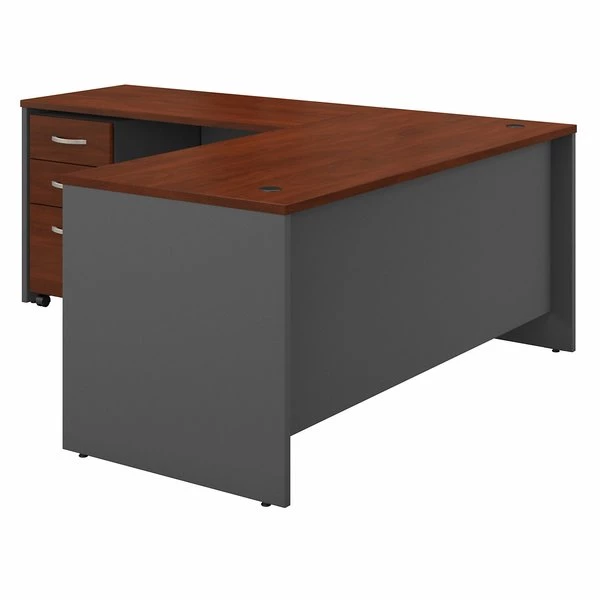 Spread out and save space with this Bush Business Furniture Series C L Shaped Desk. 66W and 48W work surfaces offer ample room for your computer, phone, assignments and more, while the thermally fused laminate finish resists scratches and stains. Feed cables through wire management grommets in the Desk surface and modesty panel to keep them out of your way. The Mobile File Cabinet rolls wherever you need it or fits conveniently underneath the L Shaped Desk to conserve floor space. Clean lines, Brushed Nickel hardware and extended modesty panels provide a professional appearance. The options are endless with Series C. This affordable commercial office furniture boasts quality craftsmanship, user-friendly features and 7 stylish finishes to blend seamlessly in any environment. Multiple layout options meet the needs of numerous workspaces, from the private or home office to reception areas and conference rooms. Affordably priced but built to last, this office furniture withstands the rigors of a 40-plus hour week. Series C evolves with your office and your preferences, allowing you to reconfigure your workspace as required with a complete line of coordinated products and accessories.