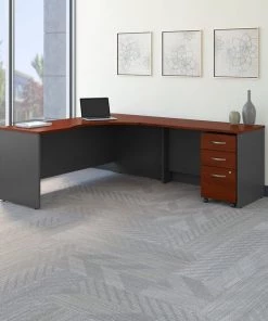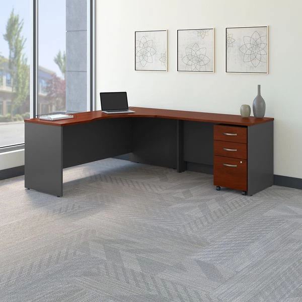 Commercial quality, comfort and style in a space-saving package. This Bush Business Furniture Series C Right Handed Corner Desk offers plenty of room to work on rugged thermally fused laminate surfaces but fits conveniently in the corner of your office. Spread out with your computer, phone and day-to-day projects while feeding cables through a wire management grommet for a clutter-free work area. Roll the Mobile File Cabinet wherever you please or store it under the Desk to save space. Two box drawers hold your office supplies, as a full-extension file drawer glides on smooth ball bearing slides for an easy reach to letter, legal and A4 documents. Brushed Nickel hardware, extended modesty panels and clean lines make a lasting impression. The options are endless with Series C. the collection withstands the rigors of a 40-plus hour week. Multiple layout options and 7 finishes meet the needs of numerous workspaces. Series C evolves with your preferences, allowing you to reconfigure your office as required with a complete line of coordinated products.