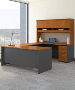 Choose this Bush Business Furniture Series C U Shaped Desk for professional looks and quality with convenient features to help you through the workday. The clean lines, Brushed Nickel hardware and extended modesty panels of Series C make a lasting impression, while thermally fused laminate surfaces and a heavy-duty construction ensure lasting durability. An expansive U Shaped Desk design offers all the workspace you need to spread out with multiple projects for years of productivity. Feed computer cables through wire management grommets in the desktop, as you keep track of current assignments on the fabric tack board and 6 cubby shelves in the Hutch. Store books, binders and more behind 4 Hutch doors, and stash supplies and papers in the Mobile File Cabinet. Roll your documents anywhere while enjoying full-extension ball bearing slides, which offer easy access to the back of the file drawer. The options are endless with Series C. the collection withstands the rigors of a 40-plus hour week. Multiple layout options and 7 finishes meet the needs of numerous workspaces. Series C evolves with your preferences, allowing you to reconfigure your office as required with a complete line of coordinated products.