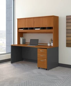 Get the workspace, storage and durability you require for years of use, and convenient features to help you make the most of every day. The Bush Business Furniture Series C 72W x 30D Office Desk with Hutch and Mobile File Cabinet provides a sturdy construction, rugged thermally fused laminate finish and tough edge banding for continued quality. Wire management grommets conceal your cables, and the expansive Office Desk gives you all the room you need to spread out with your projects. The Hutch has a fully finished back panel. A fabric tack board and 6 open cubby shelves keep current work nearby, and 4 concealed cabinets clear your work area. The Mobile File Cabinet locks for your security and includes a full-extension file drawer gliding on smooth ball bearing slides for an easy reach to documents. The options are endless with Series C. Backed by quality craftsmanship and a, the collection withstands the rigors of a 40-plus hour week. Multiple layout options and 7 finishes meet the needs of numerous workspaces. Series C evolves with your preferences, allowing you to reconfigure your office as required with a complete line of coordinated products.