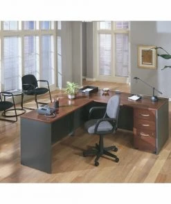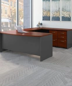 Sophisticated and spacious, this Bush Business Furniture Series C U Shaped Desk brings commercial-quality features and durability to the workplace. The expansive wraparound U Shaped Desk includes all the room a busy professional needs to spread out for years of productivity. An inviting Bow Front design offers an extended surface for guests to pull up chairs and collaborate, while integrated wire management controls your electronics cables for a tidy workspace. The thermally fused laminate surface and sturdy construction combine with Brushed Nickel hardware and extended modesty panels for a lasting professional appearance you'll love. Take care of your storage needs with a pair of Mobile File Cabinets, which fit under the Desk or roll anywhere. The Cabinets lock for your security and feature 3 full-extension file drawers and 2 box drawers combined. The options are endless with Series C. the collection withstands the rigors of a 40-plus hour week. Multiple layout options and 7 finishes meet the needs of numerous workspaces. Series C evolves with your preferences, allowing you to reconfigure your office as required with a complete line of coordinated products.