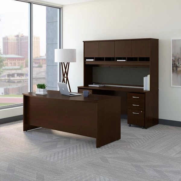 Outfit your private office with the Bush Business Furniture Series C Bow Front Desk with Storage. Get executive-level looks along with all the workspace and storage you need at an affordable price. This combination includes a matching 72W Bow Front Desk and Credenza, which offer ample space to spread out on durable thermally fused laminate surfaces. The extended Bow Front Desk design invites guests to pull up chairs to meet or collaborate. Don't let important notes or papers out of sight with 6 cubby shelves and a fabric tack board, as you stash larger items behind the 4 Hutch doors. A pair of Mobile File Cabinets roll under the Desk or Credenza, and anywhere else you need supplies or paperwork. Locking full-extension file drawers secure your documents and provide an easy reach to the back, while attractive Brushed Nickel hardware makes a lasting impression. The options are endless with Series C. Backed by quality craftsmanship and a, the commercial office furniture withstands the rigors of a 40-plus hour week. Multiple layout options and 7 finishes meet the needs of numerous workspaces. Series C evolves with your preferences, allowing you to reconfigure your office as required with a complete line of coordinated products.