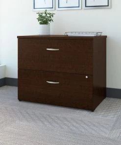 Expand your office with the Bush Business Furniture Series C 36W Lateral File Cabinet. Combine with a matching Series C Desk to extend your work surface or use the Cabinet on its own. File your letter, legal and A4 documents in 2 generous drawers gliding on smooth full-extension ball bearing slides for an effortless reach to the back. Adjustable levelers compensate for uneven flooring, while an interlocking drawer mechanism prevents against tipping. Brushed Nickel hardware and clean lines make an impressive statement, as the sturdy design fends off damage for years of professional quality. The options are endless with Series C. This affordable commercial office furniture boasts quality craftsmanship, user-friendly features and 7 stylish finishes to blend seamlessly in any environment. Multiple layout options meet the needs of numerous workspaces, from the private or home office to reception areas and conference rooms. Affordably priced but built to last, this office furniture withstands the rigors of a 40-plus hour week. Series C evolves with your office and your preferences, allowing you to reconfigure your workspace as required with a complete line of coordinated products and accessories.