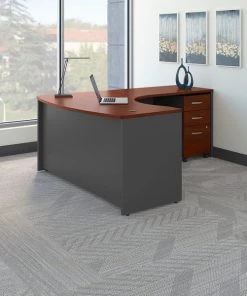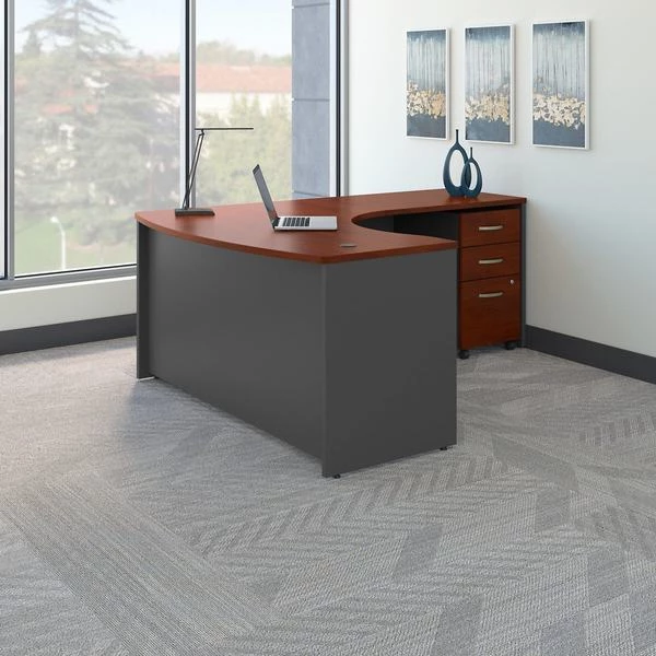 Work with the convenience you want and the durability you need. This Bush Business Furniture Series C Right Handed L Shaped Desk makes the most of your office space with a clever construction and user-friendly features. Attractive and inviting, the Bow Front design gives guests the space they need to pull up chairs, meet and collaborate. Spread out on the expansive L Shaped Desk and feed your cables through wire management grommets in the surface to keep them concealed and out of your way. The thermally fused laminate finish and sturdy construction provide long-lasting professional quality, while extended modesty panels and Brushed Nickel hardware make an impressive statement. Guide the Mobile File Cabinet throughout your office or store it under the L Shaped Desk to conserve floor space. Enjoy easy access to paperwork with a full-extension file drawer gliding on smooth ball bearing slides. The options are endless with Series C. the collection withstands the rigors of a 40-plus hour week. Multiple layout options and 7 finishes meet the needs of numerous workspaces. Series C evolves with your preferences, allowing you to reconfigure your office as required with a complete line of coordinated products.