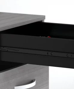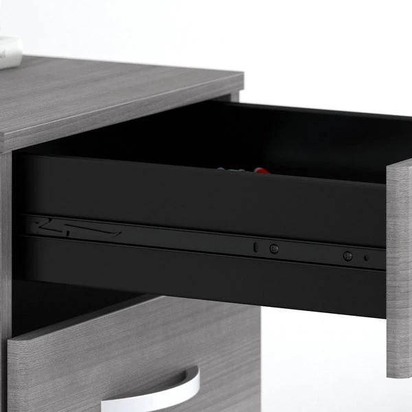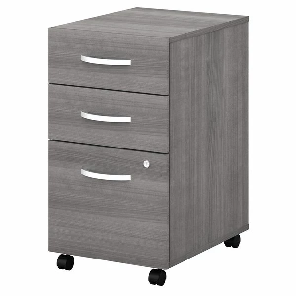 The Bush Business Furniture Studio C 3 Drawer Mobile File Cabinet rolls with you throughout your office or remains in place as needed on any surface. You'll have your letter, legal and A4-size paperwork organized in no time as the filing cabinet ships fully assembled for your convenience. Two box drawers hold your pens, notepads, small office supplies and more to organize your workspace. The file drawer opens on smooth full-extension ball bearing slides, making it easy to reach those pesky papers all the way at the back. Dual-wheeled, hooded casters keep the 3 drawer cabinet moving on your office floor or carpet. A single lock secures the bottom 2 drawers to protect sensitive paperwork and personal items. When space is at a premium, the Mobile File Cabinet conveniently fits under a coordinating Studio C Desk (sold separately). Eye-catching Brushed Nickel drawer pulls complement your choice of several contemporary or traditional finishes to make the cabinet as attractive as it is functional. This rolling file cabinet comes meets ANSI/BIFMA quality test standards. See the full collection for coordinating items available to make your office your own with Studio C.