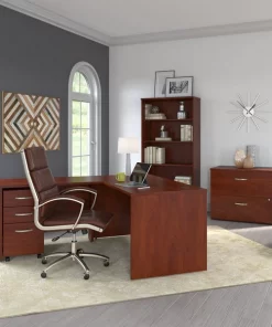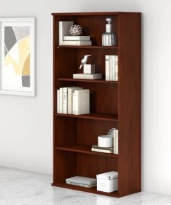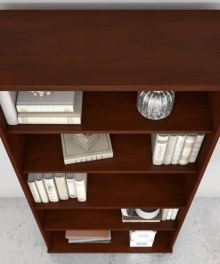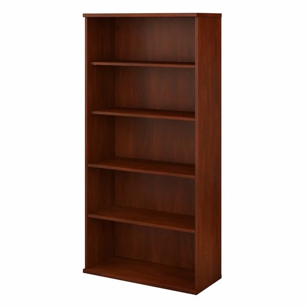 The Bush Business Furniture Studio C 5 Shelf Bookcase looks great, works hard and adjusts to fit the needs of your office. Designed with 2 fixed and 3 adjustable shelves, the tall Bookcase holds your books and reference materials with room for your favorite decorative accents. Store a variety of items on the spacious and durable shelves, designed to hold up to 50 pounds each. A thermally fused laminate finish fends off scratches, stains and dents throughout years of everyday use. Add the coordinating Bookcase Door Kit (sold separately) to conceal the lower shelves for an organized look. The 5 Shelf Bookcase features a classic design but comes in your choice of several contemporary and traditional finishes to fit perfectly in any workspace. Purchase a set of Bookcases to build a complete storage wall that organizes your office and expresses your style. This 5 tier bookshelf meets ANSI/BIFMA quality test standards. See the full collection for coordinating items available to make your office your own with Studio C.