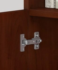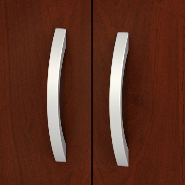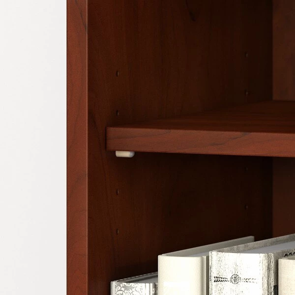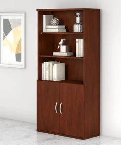 The Bush Business Furniture Studio C 5 Shelf Bookcase with Doors looks great, works hard and adjusts to fit the needs of your office. Designed with two fixed and three adjustable shelves, the Bookcase holds your books and reference materials with plenty of room for your favorite decorative accents. Confidently store a variety of items on the spacious and durable shelves, designed to hold up to 50 pounds each. A thermally fused laminate finish fends off everyday damage like scratches and stains throughout years of everyday use. The doors conceal your office supplies and add an eye-catching touch to your workspace. With attractive Brushed Nickel hardware, doors cover the two lower shelves and feature self-closing Euro-style hinges for an easy open and shut. This bookshelf features a classic design that comes in your choice of several contemporary or traditional finishes to fit in any workspace. Purchase a set of Bookcases to build a complete storage wall that organizes your office and expresses your style. This tall Bookcase with Doors comes meets ANSI/BIFMA quality test standards. See the full collection for coordinating items available to make your office your own with Studio C.