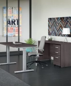 This Bush Business Furniture Studio C Height Adjustable Standing Desk and Credenza set combines wide work surfaces with a comfortable design and convenient features to keep you on task. Sit and stand throughout your day without missing a beat in your home office or at work. The electric adjustable height Desk includes a 10 foot power cord and smoothly lifts from a low of 27 inches to a high of 46.7 at the push of a button. Store your favorite heights with four programmable presets so you can use them as often as you like. The ergonomic Desk withstands years of everyday use. A durable thermally fused laminate finish resists scratches and stains, while the sturdy steel base creates a weight capacity of up to 200 pounds. This sit to stand Desk will have no problem holding all of your work materials. Make room to spread out and work on a variety of projects on the 60W Credenza Desk while storing your paperwork in the Mobile File Cabinet. For your letter, legal and A4 size files along with office supplies, the contemporary cabinet rolls anywhere or remains in place as needed. The file drawer opens on smooth full-extension ball bearing slides for an easy reach to papers in the back. This commercial office furniture set comes meets ANSI/BIFMA quality test standards for performance and safety.