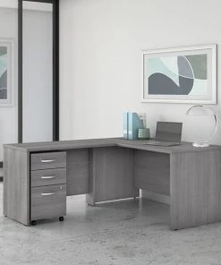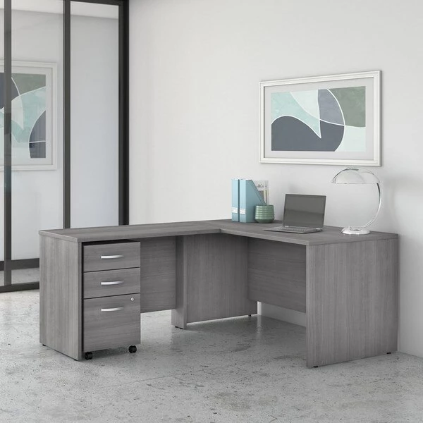 Choose this Bush Business Furniture Studio C L Shaped Desk for a comfortable design that works with you for years and a fresh finish that looks great anywhere. With a thick surface, an extended modesty panel and clean lines, the L Shaped Desk conveys a classic look that comes in your choice of several contemporary or traditional finishes to fit any workspace. The thermally fused laminate finish, durable edge banding and sturdy end panels resist scratches, stains and dents while standing up to the rigors of a 40-plus hour work week. Keep pesky computer cords out of your way with the cable management system for an organized work surface. The 42W Return attaches to either side of the 60W Desk to form a left or right handed L Shaped layout, while the 3 Drawer Mobile File Cabinet rolls with you throughout your office or remains in place as needed on any surface. One file drawer accepts legal, letter and A4-size paperwork while two box drawers organize small office supplies. A single lock secures the two bottom drawers to protect sensitive documents and personal items. This desk with storage set comes meets ANSI/BIFMA quality test standards.