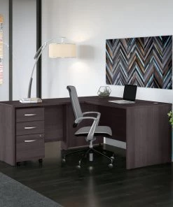 Choose this Bush Business Furniture Studio C L Shaped Desk for a comfortable design that works with you for years and a fresh finish that looks great anywhere. With a thick surface, an extended modesty panel and clean lines, the L Shaped Desk conveys a classic look but adds a contemporary White or Storm Gray finish to meet the style needs of the modern workspace. The thermally fused laminate finish, durable edge banding and sturdy end panels resist scratches, stains or dents while standing up to the rigors of a 40-plus hour work week. Keep pesky computer cords out of your way with the cable management system for an organized work surface. The 42W Return attaches to either side of the Desk to form a left or right handed L Shaped layout, while the 3 Drawer Mobile File Cabinet rolls with you throughout your office or remains in place as needed on any surface. This contemporary office furniture comes meets ANSI/BIFMA quality test standards.