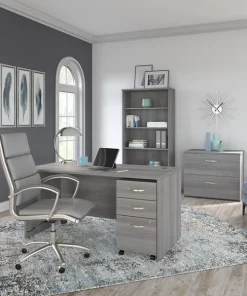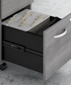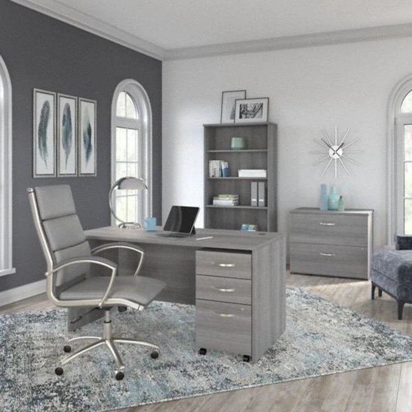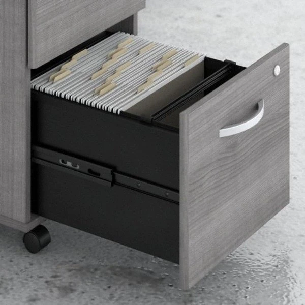 Choose the Bush Business Furniture Studio C 60W Office Desk with Mobile File Cabinet for a durable workspace that looks great and lasts for years. With a thick surface, an extended modesty panel and clean lines, the Office Desk conveys a classic look that comes in your choice of several contemporary or traditional finishes to fit any workspace. The thermally fused laminate finish, durable edge banding and sturdy end panels resist scratches, stains and dents while standing up to the rigors of a 40-plus hour work week. Keep pesky computer cords out of your way with the cable management system for an organized work surface. The 3 Drawer Mobile File Cabinet rolls with you throughout your office or remains in place as needed on any surface. A full-extension file drawer glides on smooth ball bearing slides for an easy reach to letter, legal and A4-size paperwork while two box drawers organize office supplies. A single lock secures the two bottom drawers to protect sensitive documents and personal items. This desk with storage set comes meets ANSI/BIFMA quality test standards.