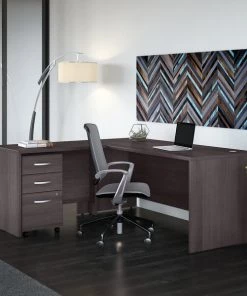 Choose this Bush Business Furniture Studio C L Shaped Desk for a comfortable design that works with you for years and a fresh finish that looks great anywhere. With a thick surface, an extended modesty panel and clean lines, the L Shaped Desk conveys a classic look but adds a contemporary White or Storm Gray finish to meet the style needs of the modern workspace. The thermally fused laminate finish, durable edge banding and sturdy end panels resist scratches, stains or dents while standing up to the rigors of a 40-plus hour work week. Keep pesky computer cords out of your way with the cable management system for an organized work surface. The 42W Return attaches to either side of the Desk to form a left or right handed L Shaped layout, while the 3 Drawer Mobile File Cabinet rolls with you throughout your office or remains in place as needed on any surface. This contemporary office furniture comes meets ANSI/BIFMA quality test standards.