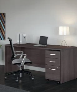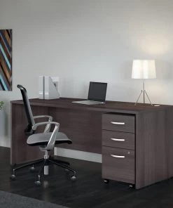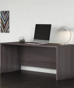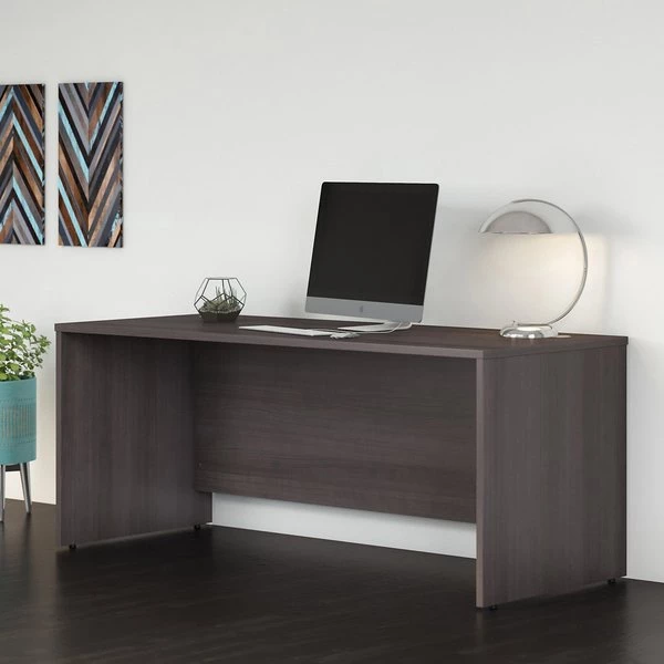 Choose the Bush Business Furniture Studio C 72W Office Desk for a durable design that works hard for years with a fresh finish that looks great anywhere. With a thick surface, an extended modesty panel and clean lines, the Office Desk conveys a classic look but adds a contemporary White or Storm Gray finish to meet the style needs of the modern workspace. The thermally fused laminate finish, durable edge banding and sturdy end panels resist scratches, stains or dents while standing up to the rigors of a 40-plus hour work week. Keep pesky computer cords out of your way with the cable management system for an organized work surface. Combine the Desk with matching products and accessories from the Studio C collection to create a unique office for the way you work. This contemporary office furniture comes meets ANSI/BIFMA quality test standards. See the full collection for coordinating items available to make your office your own with Studio C.