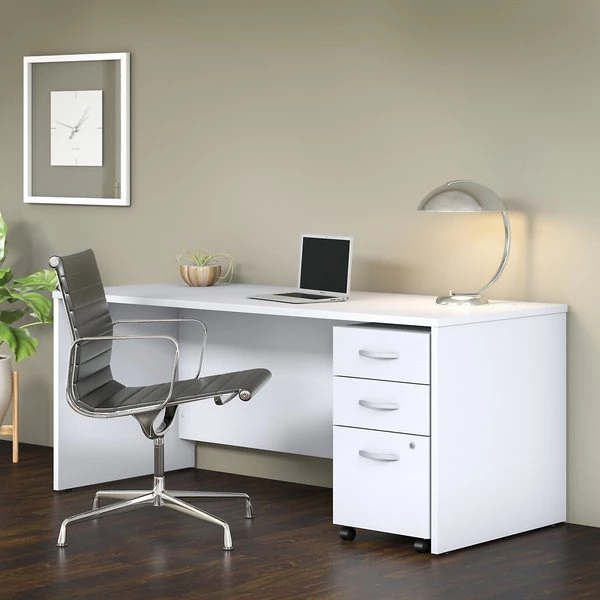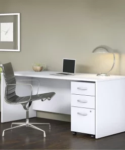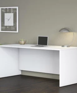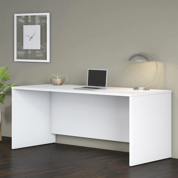 Choose the Bush Business Furniture Studio C 72W Office Desk for a durable design that works hard for years with a fresh finish that looks great anywhere. With a thick surface, an extended modesty panel and clean lines, the Office Desk conveys a classic look but adds a contemporary White or Storm Gray finish to meet the style needs of the modern workspace. The thermally fused laminate finish, durable edge banding and sturdy end panels resist scratches, stains or dents while standing up to the rigors of a 40-plus hour work week. Keep pesky computer cords out of your way with the cable management system for an organized work surface. Combine the Desk with matching products and accessories from the Studio C collection to create a unique office for the way you work. This contemporary office furniture comes meets ANSI/BIFMA quality test standards. See the full collection for coordinating items available to make your office your own with Studio C.