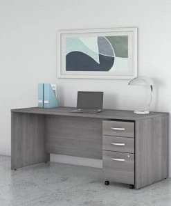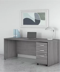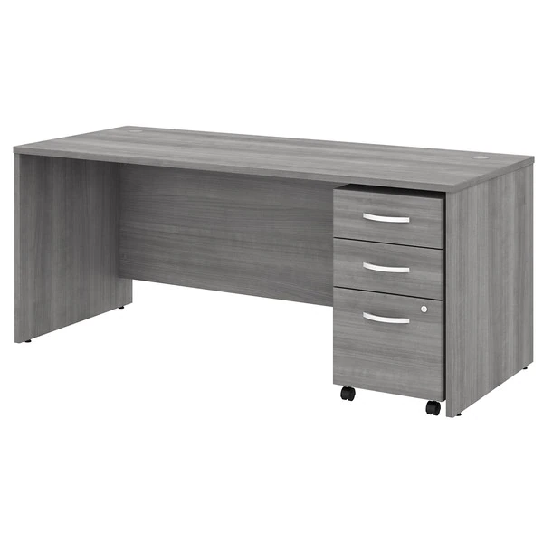 Choose the Bush Business Furniture Studio C 72W Office Desk with Mobile File Cabinet for a durable workspace that looks great and lasts for years. With a thick surface, an extended modesty panel and clean lines, the Office Desk conveys a classic look that comes in your choice of several contemporary or traditional finishes to fit any workspace. The thermally fused laminate finish, durable edge banding and sturdy end panels resist scratches, stains and dents while standing up to the rigors of a 40-plus hour work week. Keep pesky computer cords out of your way with the cable management system for an organized work surface. The 3 Drawer Mobile File Cabinet rolls with you throughout your office or remains in place as needed on any surface. A full-extension file drawer glides on smooth ball bearing slides for an easy reach to letter, legal and A4-size paperwork while two box drawers organize office supplies. A single lock secures the two bottom drawers to protect sensitive documents and personal items. This desk with storage set comes meets ANSI/BIFMA quality test standards.