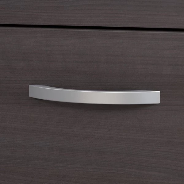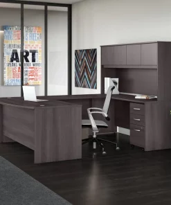 Give your office the workspace you need and the style you deserve with this Bush Business Furniture Studio C U Shaped Desk with Hutch and Mobile File Cabinet. The extended surface of the 72W x 36D Bow Front Desk offers guests a rounded front to pull up a chair and collaborate, while the expansive U shaped configuration has all the room you could ever want to spread out and multitask. With a thermally fused laminate finish, this office set stands up to years of everyday use. Keep pesky computer cords out of your way with a cable management system for a neat work surface. With 4 doors featuring self-closing Euro-style hinges, the Hutch conveniently stores office supplies, books and more. The 3 Drawer Mobile File Cabinet rolls with you throughout your office or remains in place as needed on any surface. The popular, classic office furniture design receives a contemporary update with trendy White and Storm Gray finish options to fit seamlessly in a private office or as part of a larger environment. This office set comes meets ANSI/BIFMA quality test standards for performance and safety.