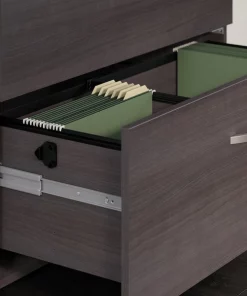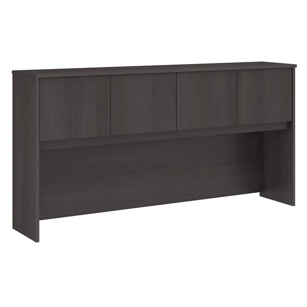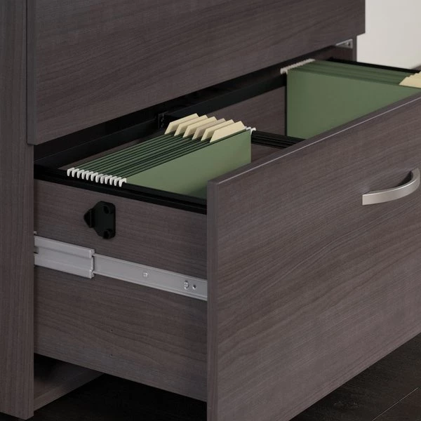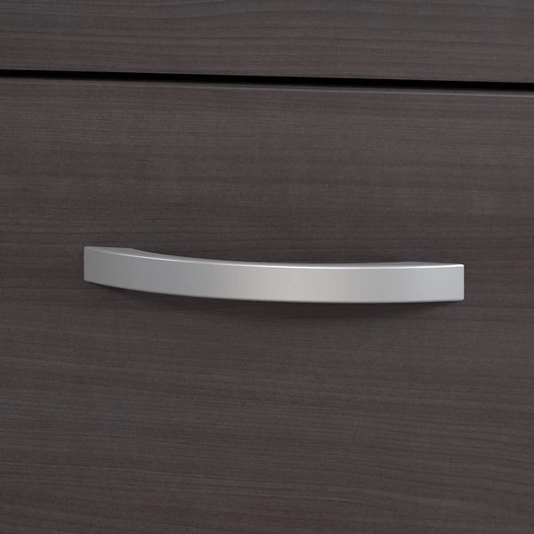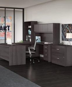 Give your office the workspace you need and the style you deserve with this Bush Business Furniture Studio C U Shaped Desk, Hutch, Bookcase and File Cabinets. The extended surface of the 72W x 36D Bow Front Desk offers guests a rounded front to pull up a chair and collaborate, while the expansive U shaped configuration has all the room you could ever want to spread out and multitask. With a thermally fused laminate finish, this office set stands up to years of everyday use. Keep pesky computer cords out of your way with a cable management system for a neat work surface. With 4 doors featuring self-closing Euro-style hinges, the Hutch conveniently stores office supplies, books and more. The 5 Shelf Bookcase with Doors mixes open and concealed storage, providing flexibility with 3 adjustable shelves. The 3 Drawer Mobile File Cabinet rolls with you throughout your office or remains in place as needed on any surface. Featuring 2 full-extension drawers opening on smooth ball bearing slides, the Lateral File Cabinet organizes your letter, legal and A4-size documents. The popular, classic office furniture design receives a contemporary update with trendy White and Storm Gray finish options to fit seamlessly in a private office or as part of a larger environment. This office set comes meets ANSI/BIFMA quality test standards for performance and safety.